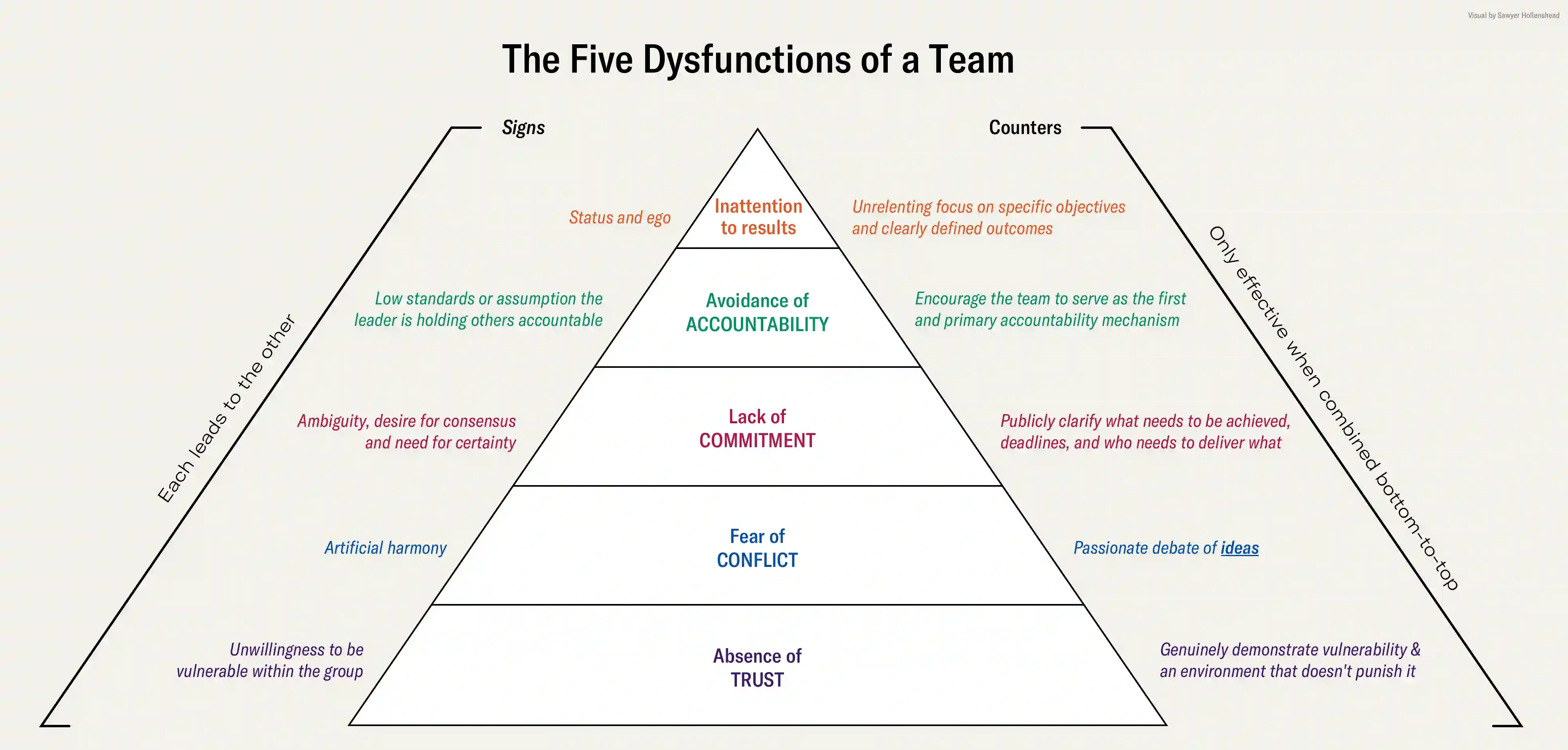 After reading "The Five Dysfunctions of a Team", I created this visualization of the framework outlined in the book, as a way to synthesize my notes. There's a lot more to it than this, but I found this to be a new and useful lens for me to reflect and look at teams through.